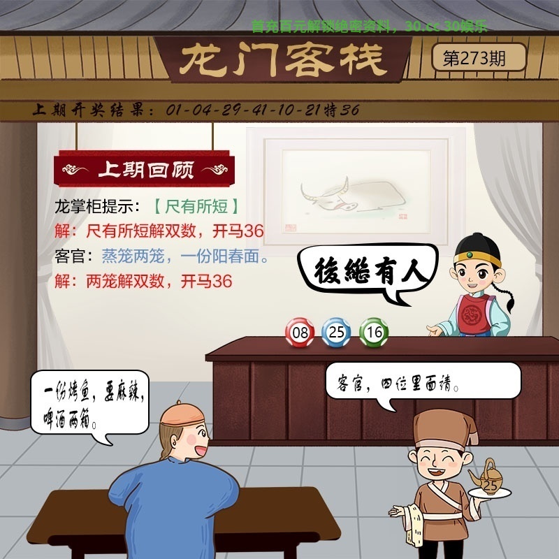 275期:【本草纲目】破解龙门客栈 掌柜:一知半解 解释:意思是知道、理解的只是一丁半点 小二:客官,今天很早嘛 解释:无 客官:麻辣香锅,青菜,炒鸡蛋 解释:青菜解菜肖的生肖猪、鼠、鸡、猴 特肖:马兔虎鼠羊龙蛇鸡猴 |